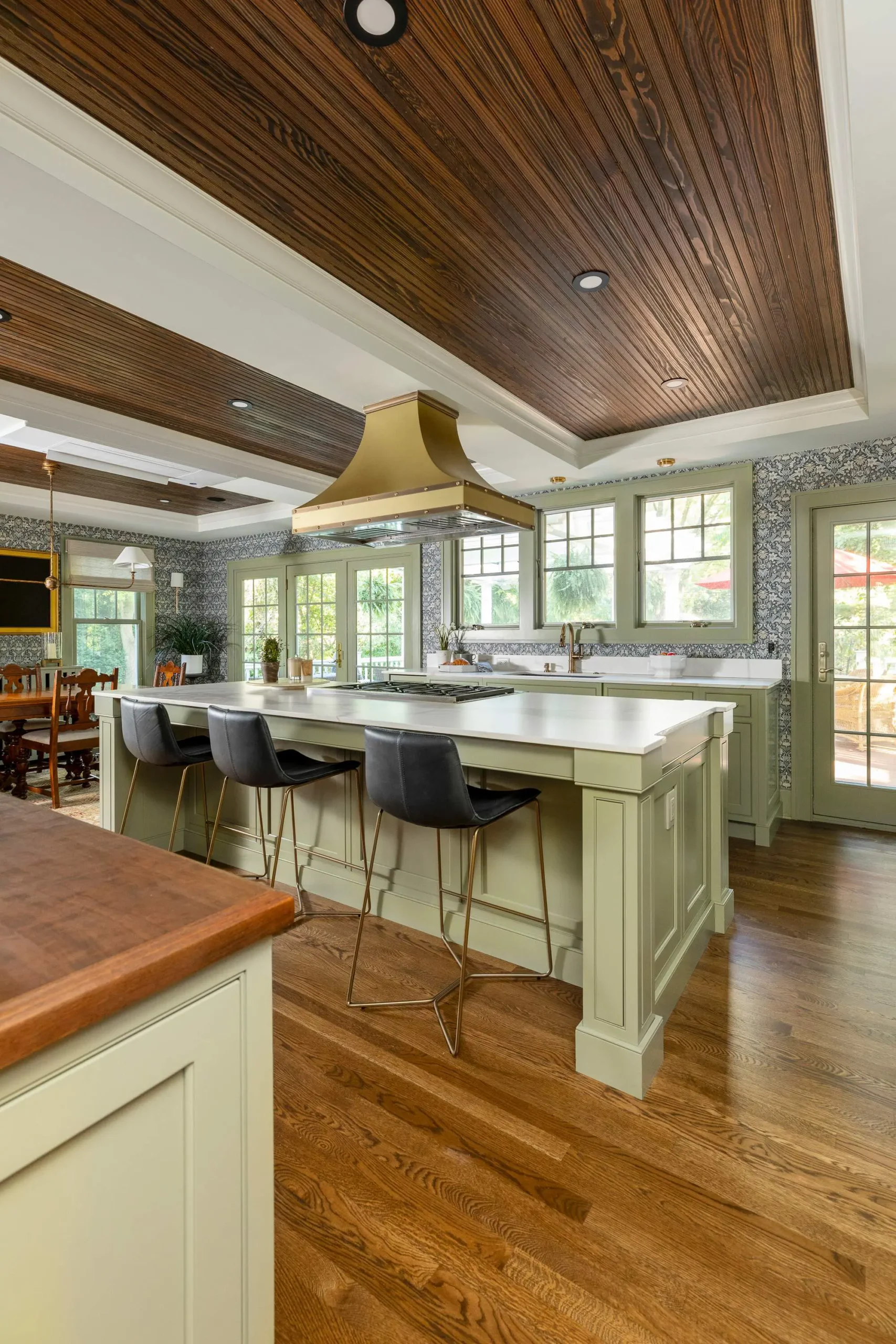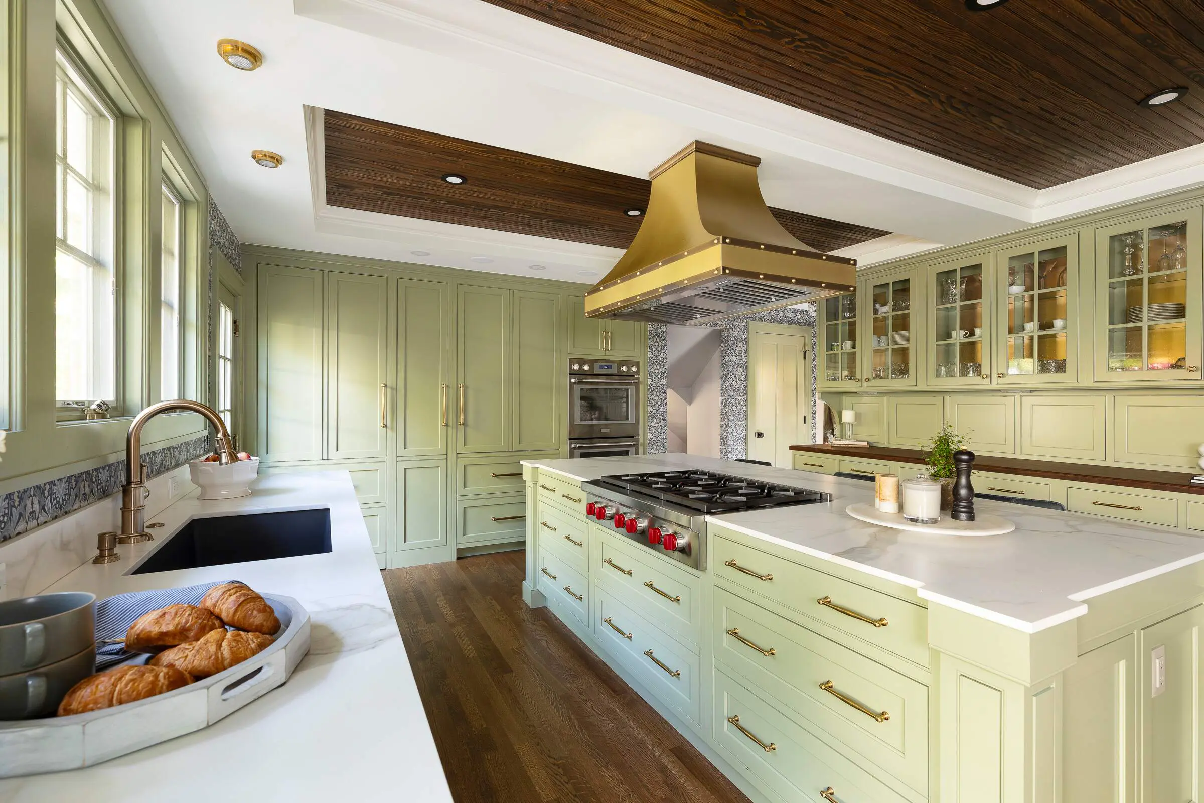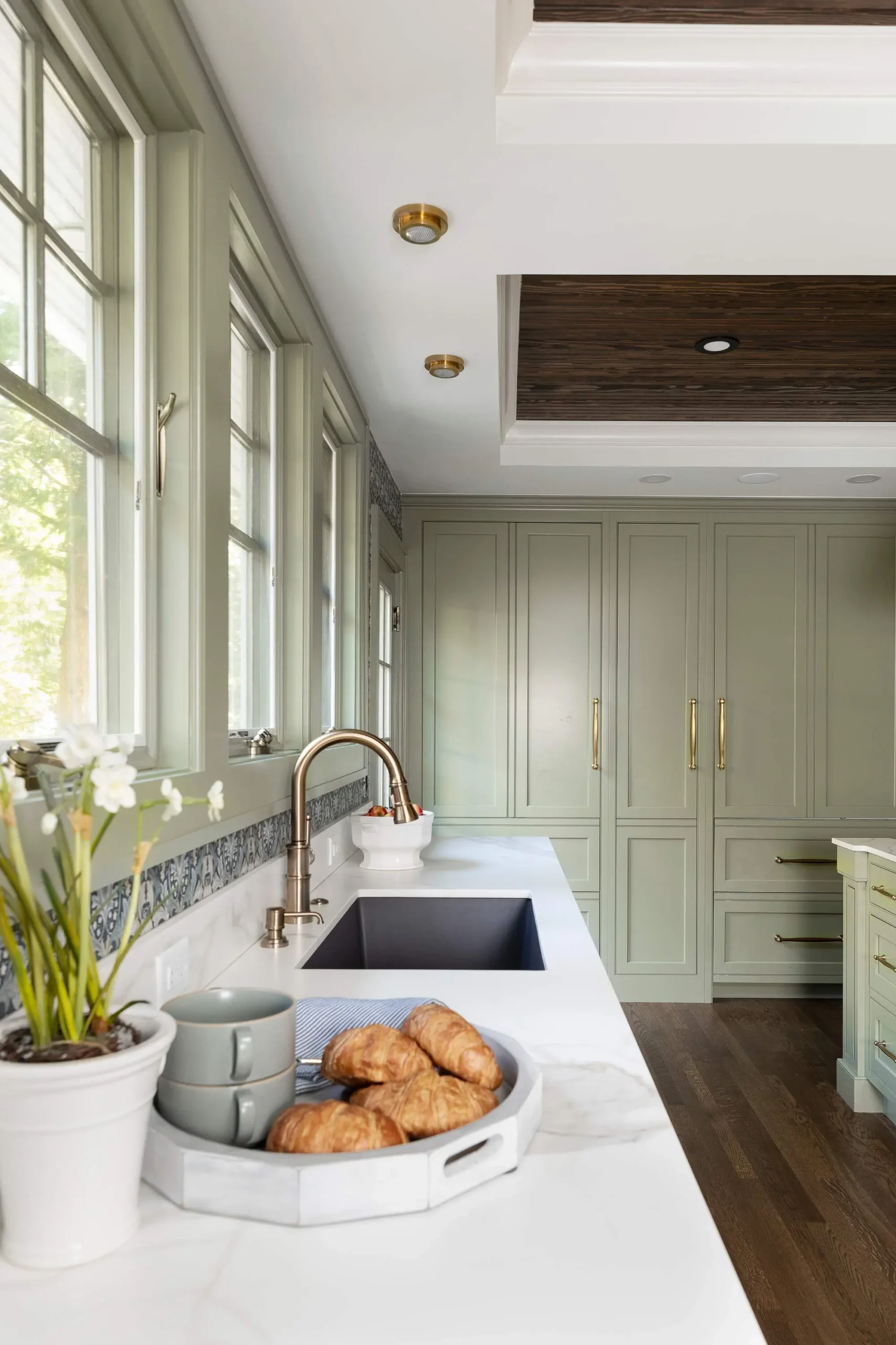 The design was elevated with Plain & Fancy cabinetry in a Sherwin-Williams Green Earth finish, paired with Top Knobs hardware and a discreet hidden pantry. The kitchen now features a Blanco sink, Brizo faucet, Sub-Zero Wolf appliances, a custom Coppersmith hood, Cove dishwasher, and curated Visual Comfort lighting—bringing together performance, beauty, and thoughtful detail throughout the space.