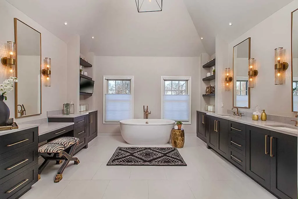 Although this stately home, built in Grosse Pointe Farms, featured a master bathroom with a functional layout and ample size, the homeowners were eager for a major upgrade. The oversized tub deck dominated the space, making the room feel smaller and limiting access to the windows, leaving the overall design feeling outdated.